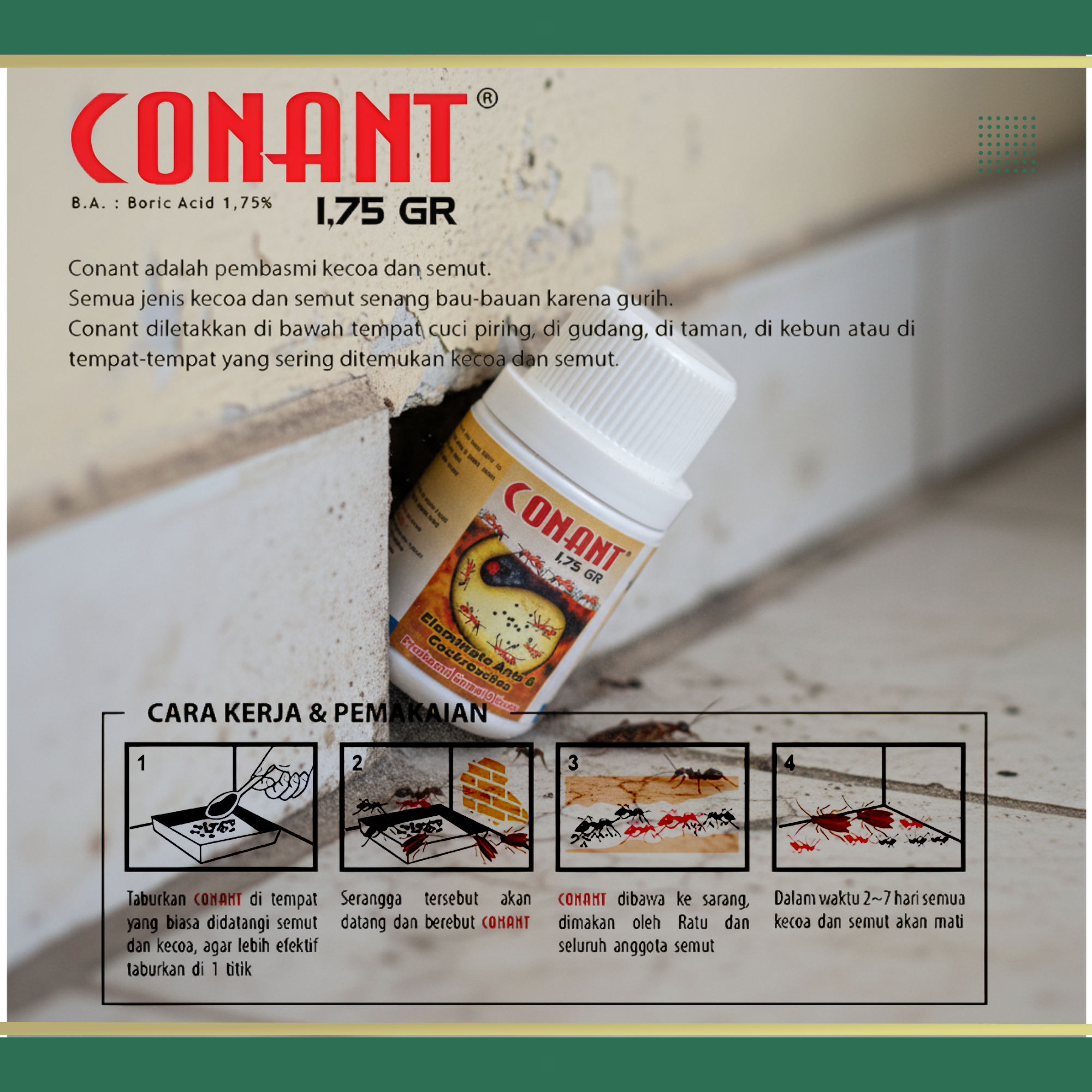 CONANT 1,75 GR memberikan efek pengendalian koloni, bukan hanya membunuh serangga yang terlihat. Mekanisme kerja lambat memungkinkan distribusi racun ke seluruh sarang, menghasilkan pengendalian jangka panjang hingga beberapa bulan.