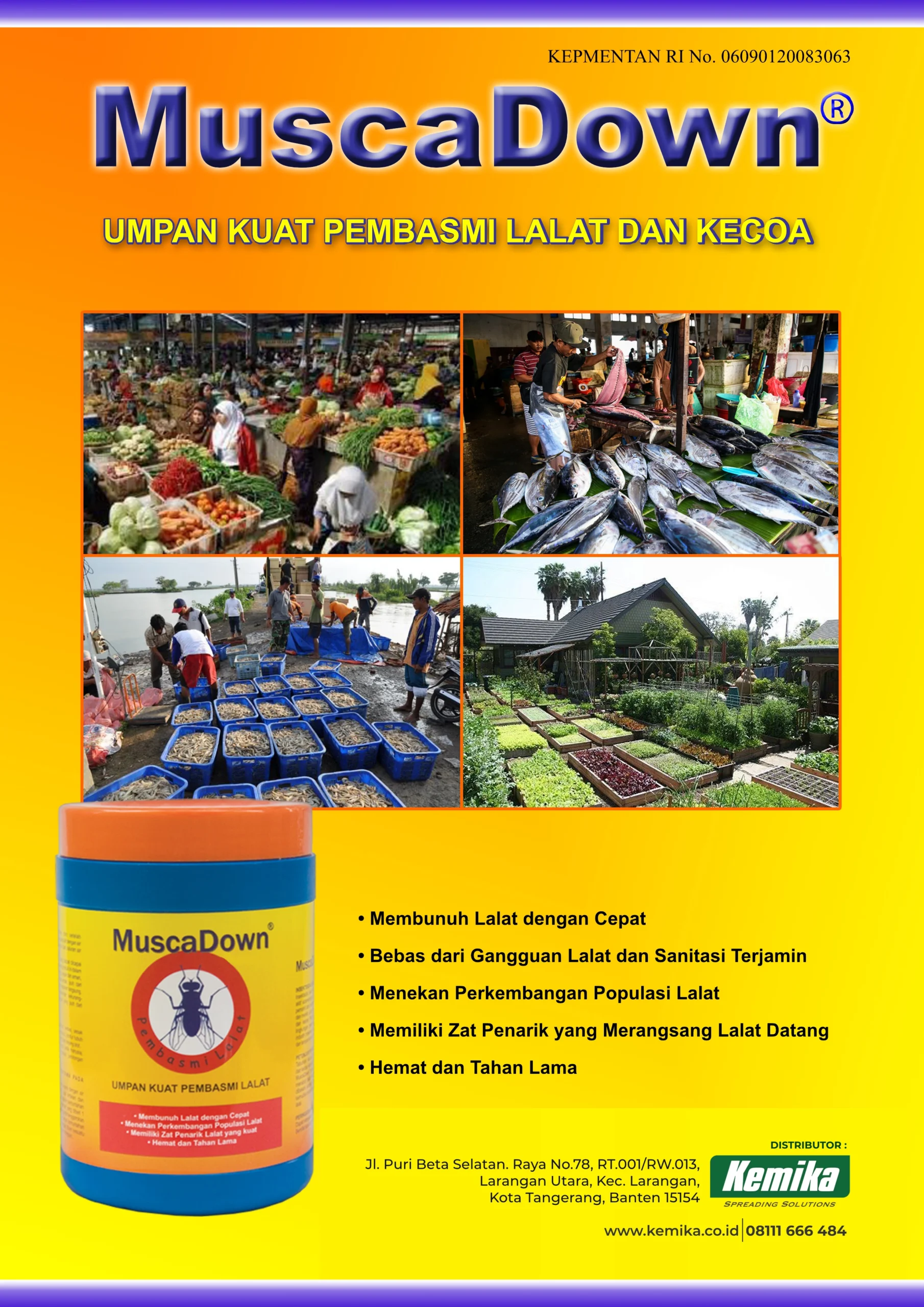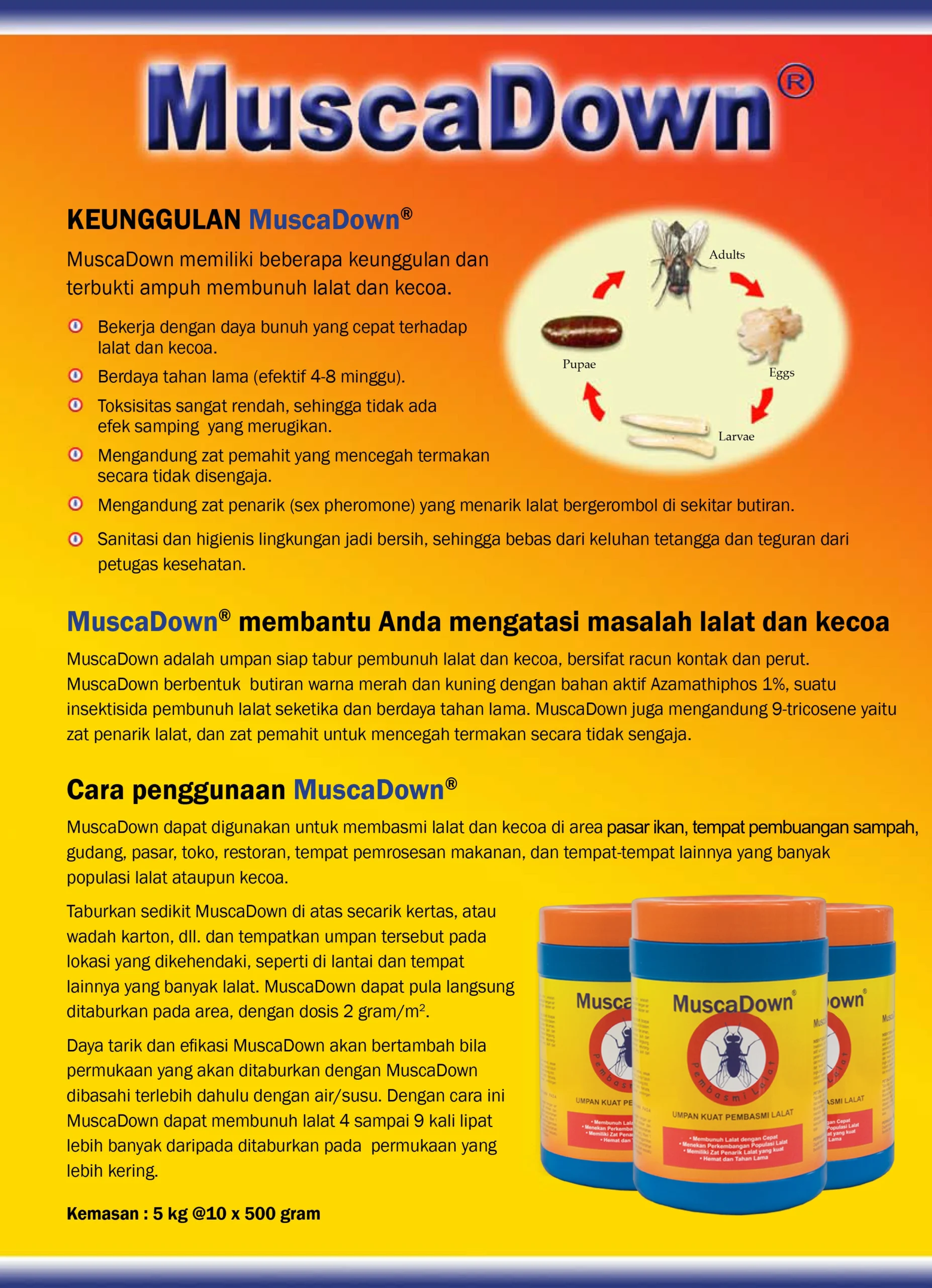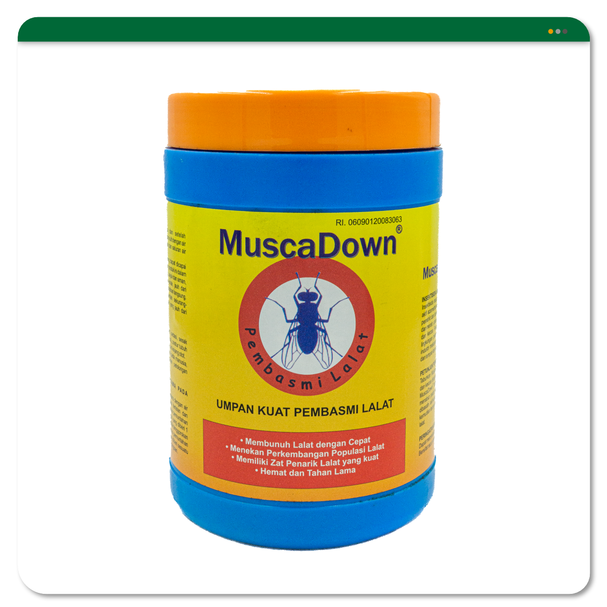 Muscadown® 1 GR adalah insektisida umpan tabur untuk pengendalian lalat dewasa dan kecoa, mengandung Azamethiphos 1% yang bekerja sebagai racun kontak dan pencernaan. Produk ini diperkaya 9-tricosene sebagai atraktan lalat untuk meningkatkan daya tarik umpan, sehingga efektif digunakan pada area dengan kepadatan lalat tinggi seperti pasar, TPS, peternakan, dan lingkungan komersial.