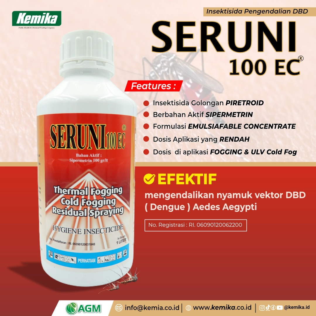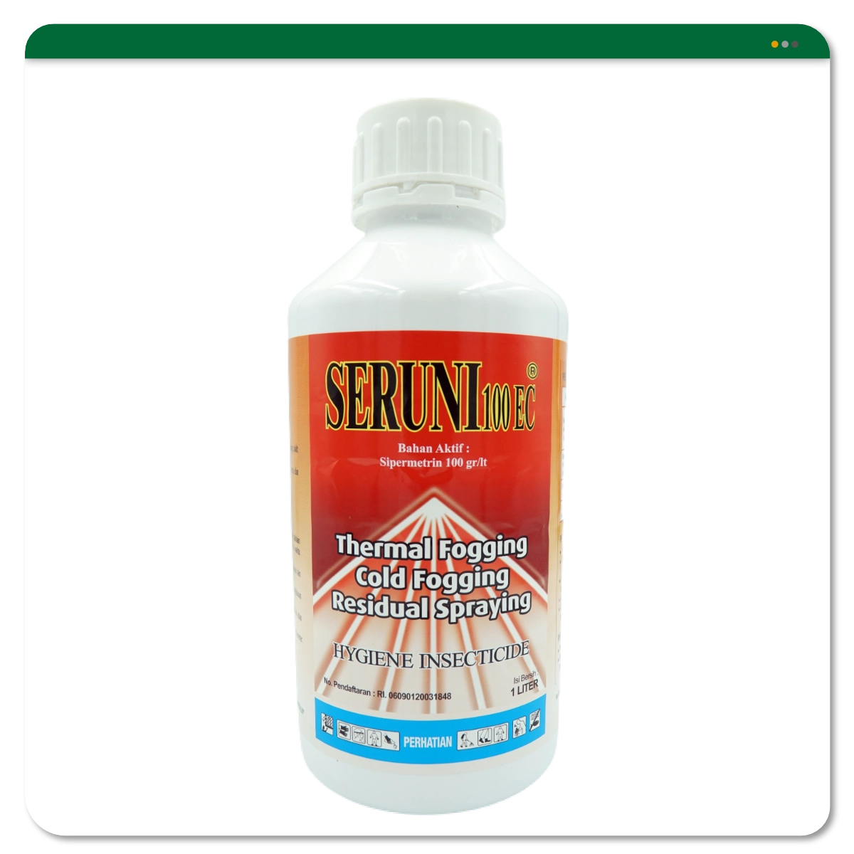 Seruni 100 EC adalah insektisida berbahan aktif Cypermethrin 100 g/L dari golongan pyrethroid sintetik dengan formulasi Emulsifiable Concentrate (EC). Produk ini berbentuk cairan berwarna putih dan dapat diemulsikan dalam air, sehingga dapat diaplikasikan melalui metode fogging, ULV, dan penyemprotan residual. Seruni 100 EC digunakan untuk pengendalian nyamuk, lalat, dan kecoa, dengan karakter kerja cepat yang mendukung penanganan infestasi serangga di berbagai kondisi lapangan.